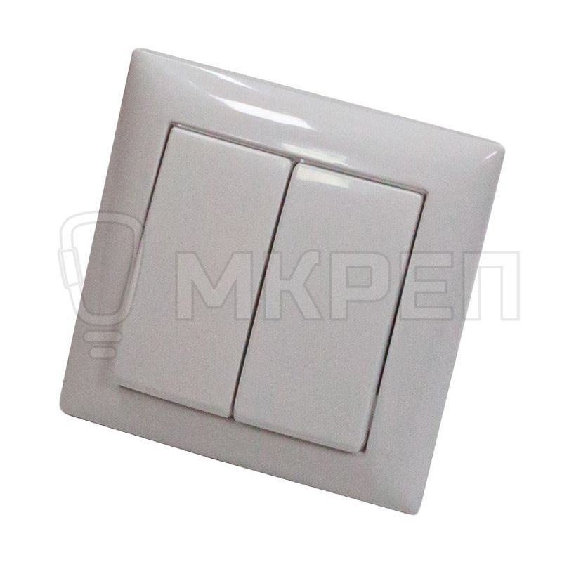 Представляет собой двухклавишный выключатель. Изготовлен из пластика белого цвета.