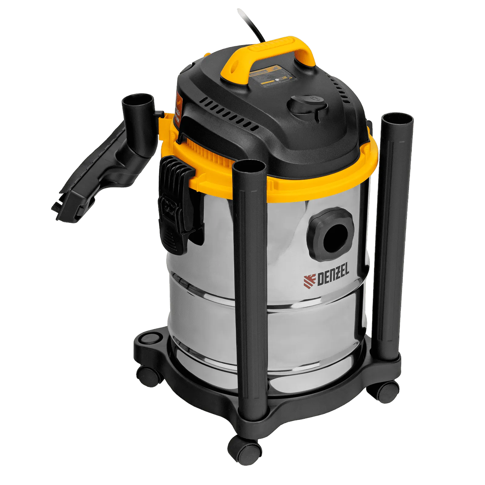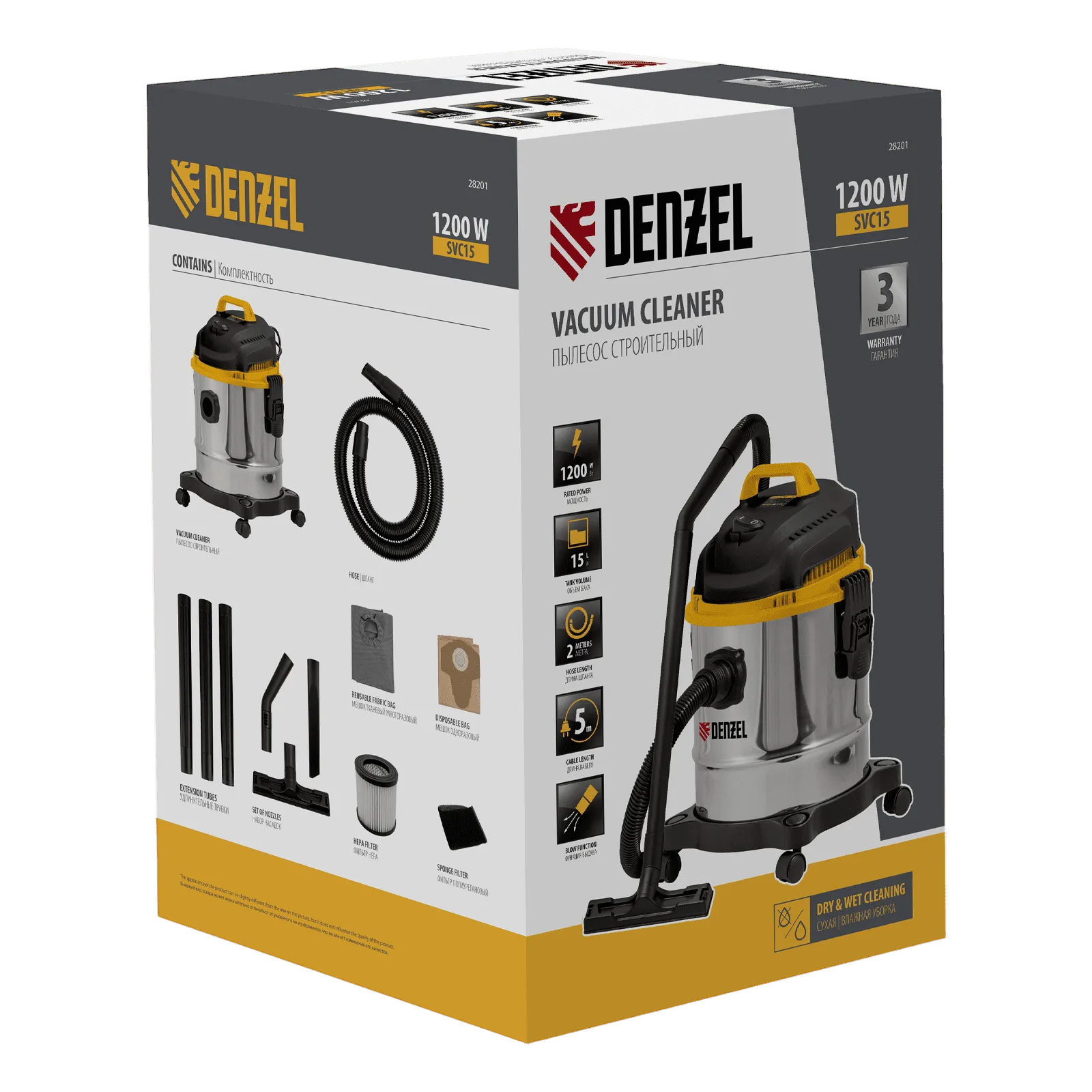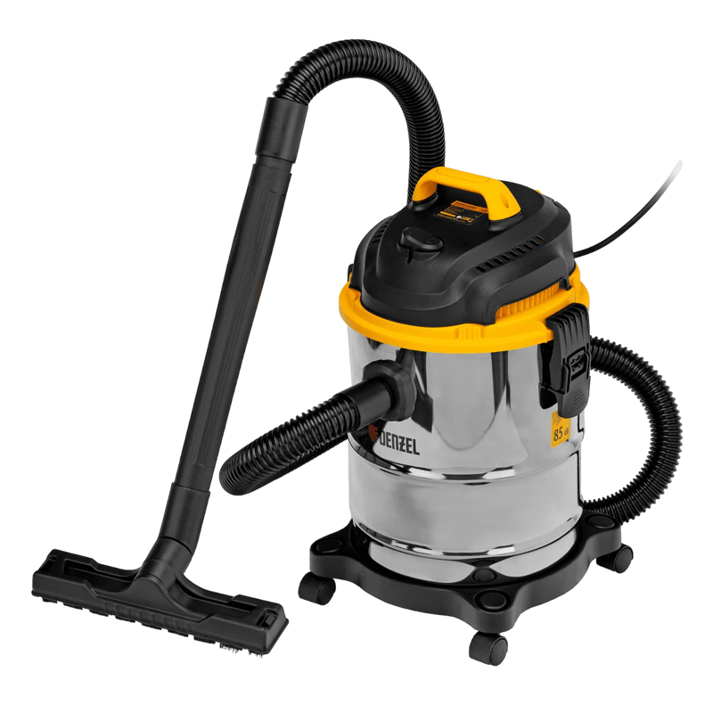 Пылесос строительный Denzel SVC15 мощностью 1200 Вт, с баком объемом 15 л и шлангом длиной 2 м, предназначен для уборки бетонной, кирпичной пыли, опилок, стружки и других твердых отходов. Функция влажной уборки позволяет собирать воду с пола.