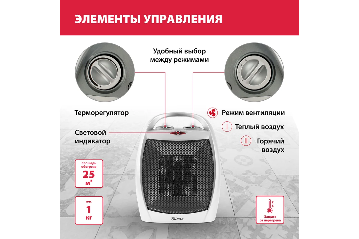 Тепловентилятор MTX FHC-1500 имеет 3 режима работы: вентилятор и нагрев 750/1500 Вт — и используется для обогрева комнат площадью до 20 кв. м на даче или в квартире. Он поддерживает необходимую температуру в холодную погоду и обеспечивает вентиляцию помещения в жару. Благодаря керамическому нагревательному элементу тепловентилятор не сжигает пыль, не выделяет вредных веществ и не сушит воздух, а также отличается повышенной пожаробезопасностью.