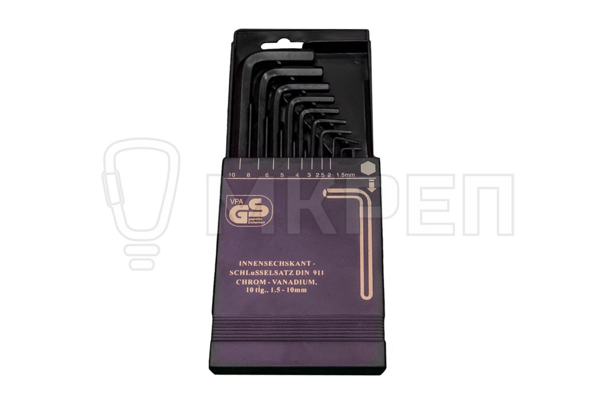 Набор состоит из шестигранных ключей размерами от 1,5 до 10 мм. Инструмент изготовлен из качественной стали, защищен от коррозии оксидированием.