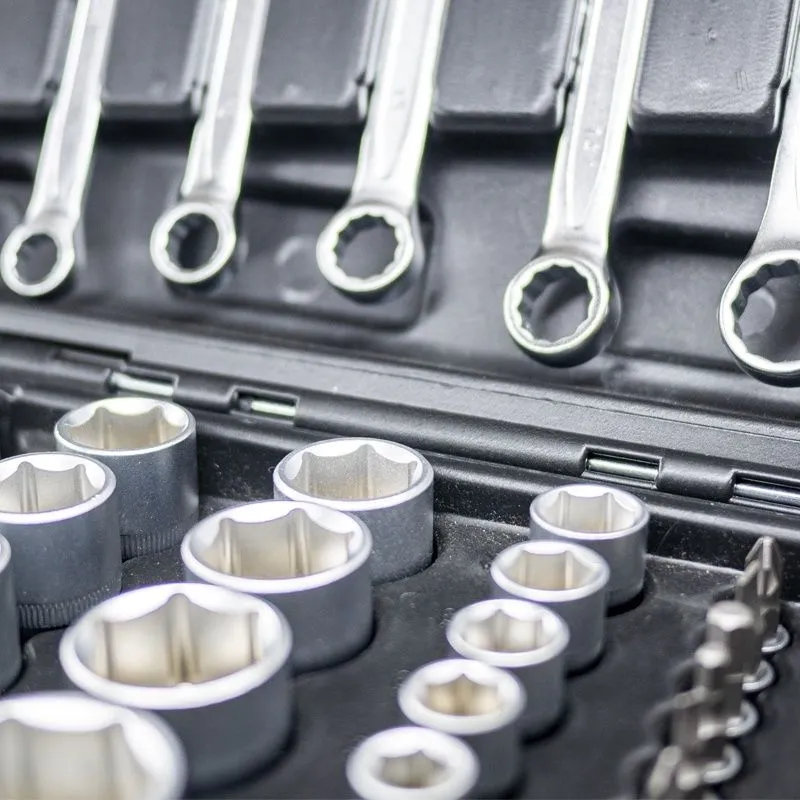 Комплект подходит для работы на производстве или в автомастерской. Комплект стандартной оснастки значительно расширен наличие дополнительных карданов и удлинителей.