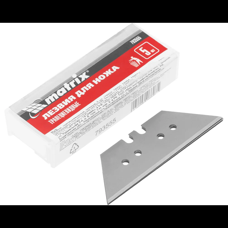 Прямые трапециевидные лезвия Matrix шириной 19 мм и длиной 61 мм, 5 шт. в упаковке, - сменные элементы для строительных ножей Matrix. Благодаря остро заточенным режущим кромкам они подходят для разрезания линолеума, картона, пластика, гипсокартона, раскройки обоев. Используются в профессиональной и бытовой сфере.