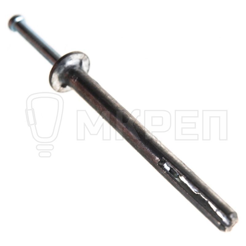 Дюбель гвоздь металлический состоит из стального дюбеля с ограничительным бортиком и распорного гвоздя, которым осуществляется крепление. Забиваемый металлический дюбель гвоздь разделяется на два клинообразных сегмента, между которыми вбивается гвоздь с клинообразным концом, разжимающий их.