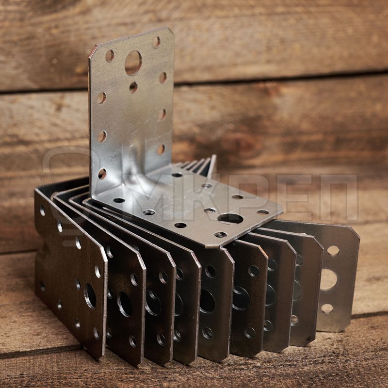 Уголок крепёжный усиленный KUU — металлическая пластина, согнутая под прямым углом. По центру проходит ребро жесткости. На обоих плечах (сторонах уголка) есть отверстия круглой формы.