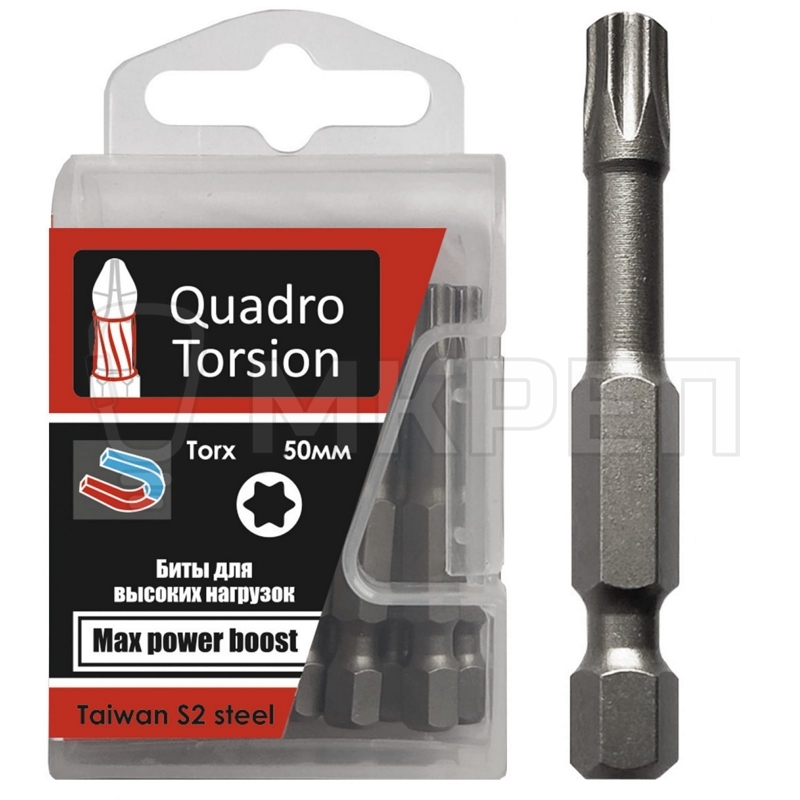 Изготовлена из стабильной стали марки S2, которая проходит все этапы закалки согласно стандарту AISI. Твёрдость после закалки до 64 HRC. Оснащена суженной шейкой, которая позволяет бите немного скручиваться и пружинить обратно, ликвидируя пики нагрузок, за счет чего продлевается срок службы. Все биты намагничены.
