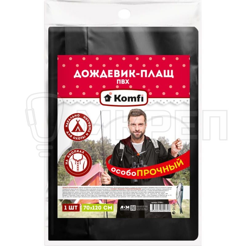 Сверхпрочный дождевик-плащ с капюшоном Komfi черный, двухслойный ПВХ, на кнопках, 150 мкм – идеальный выбор для охоты, туризма, рыбалки.