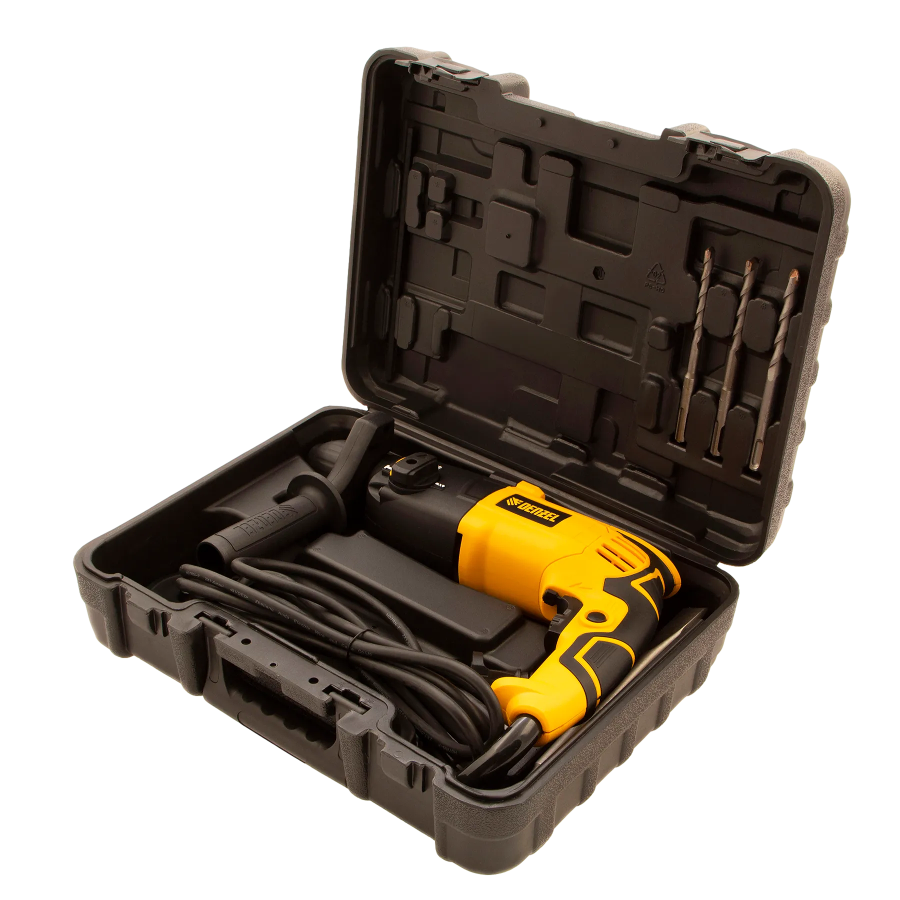 Электрический перфоратор DENZEL RH-750-24 используется при ремонтных и строительных работах для решения задач, требующих сверления или бурения отверстий в любых материалах.Патрон SDS-plus. Обеспечивает надежную фиксацию бура и делает быстрой замену оснастки.Предохранительная муфта. Обеспечивает защиту оператора во время заклинивания оснастки.Оснастка в комплекте. Начните работу сразу – в кейсе вы найдете пику, долото и три бура, чтобы испытать перфоратор по полной.