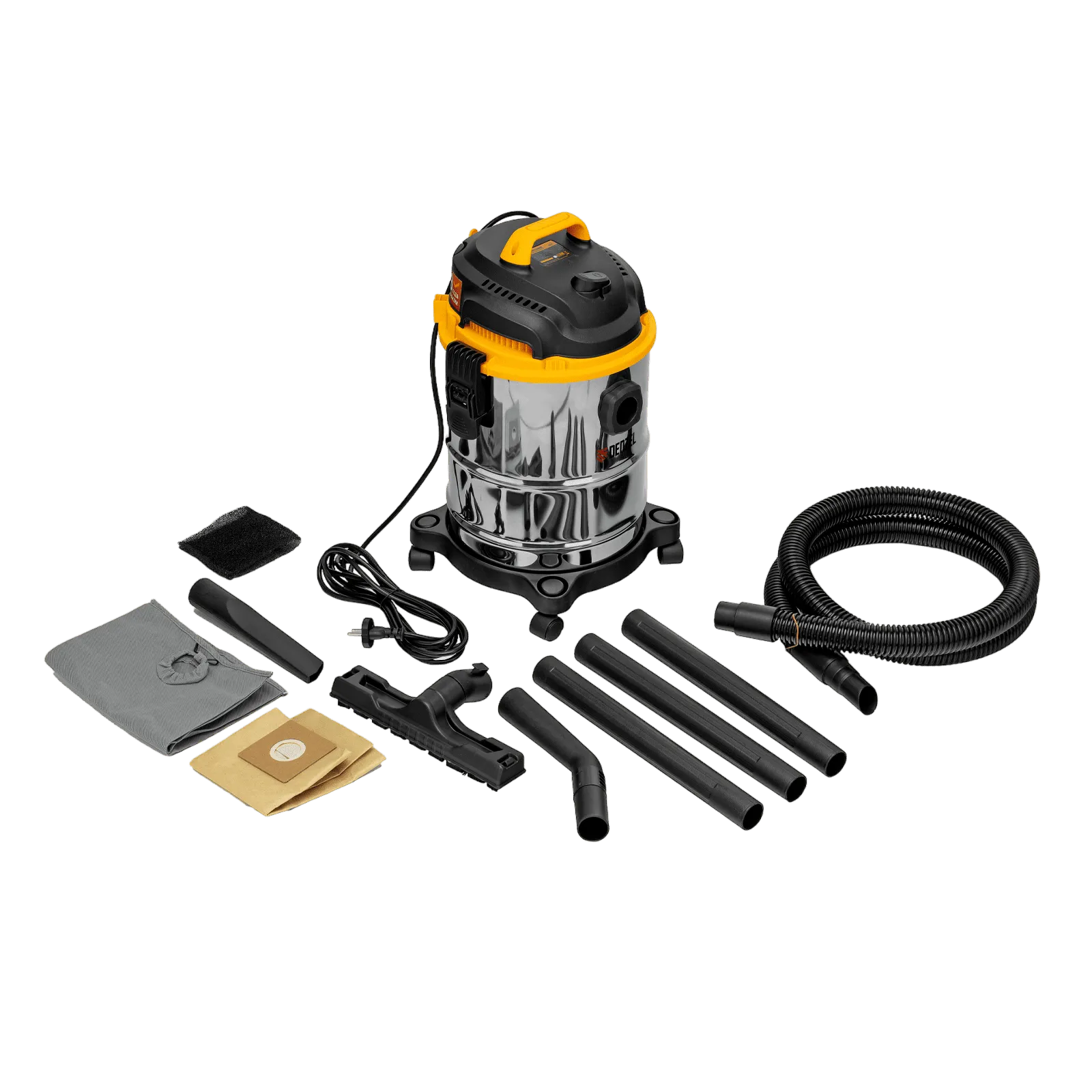 Пылесос строительный Denzel SVC15 мощностью 1200 Вт, с баком объемом 15 л и шлангом длиной 2 м, предназначен для уборки бетонной, кирпичной пыли, опилок, стружки и других твердых отходов. Функция влажной уборки позволяет собирать воду с пола.