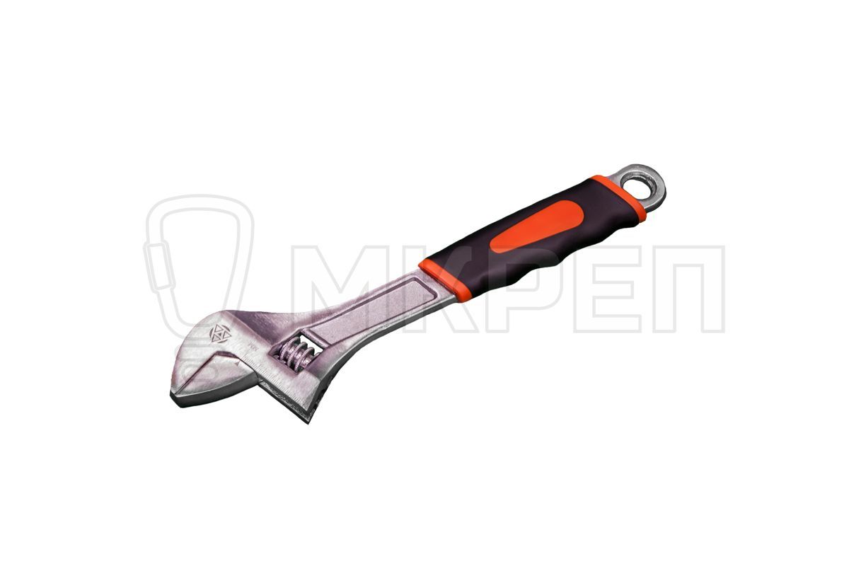 Гаечный разводной ключ с прорезиненной ручкой используется для работы с крепежом различной формы.