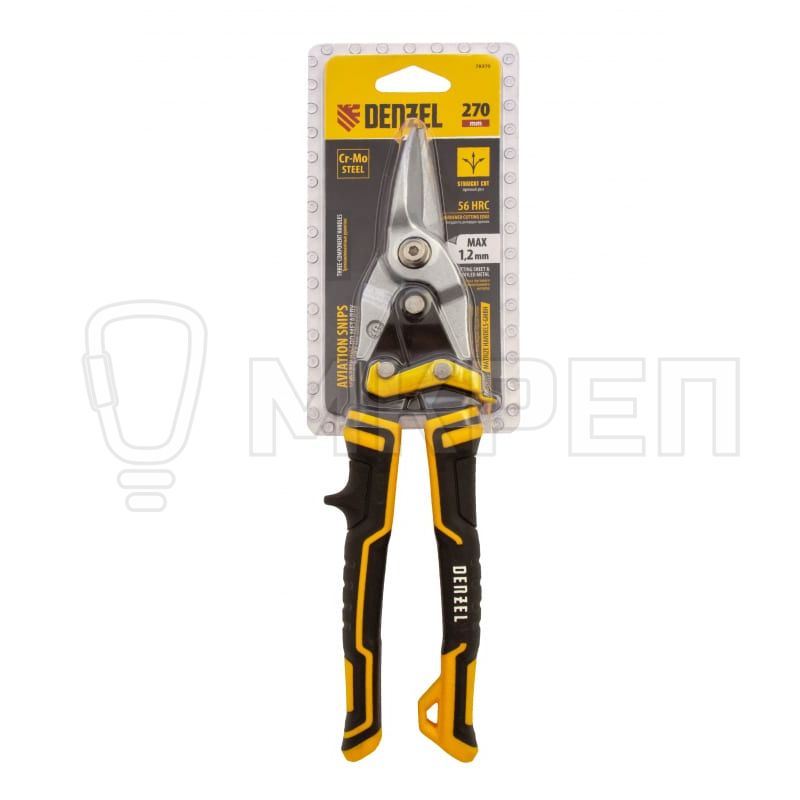 Ножницы по металлу Denzel общей длиной 270 мм, из стали-CrMo, с трехкомпонентными рукоятками, предназначены для прямого реза листовых металлических заготовок и металлопрофиля толщиной до 1,2 мм. Инструмент отличается усиленной конструкцией осевого шарнира, поэтому рассчитан на профессиональное использование. Незаменим при осуществлении строительных, кровельных и слесарных работ.