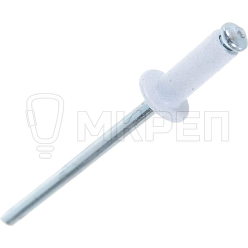 Материал: рубашка данной заклепки изготовлена из алюминия, которому присущи легкость и коррозийная стойкость. Вытяжная часть, в свою очередь — из стали, основными преимуществами которой можно считать твердость и прочность. Шляпка имеет белый цвет.