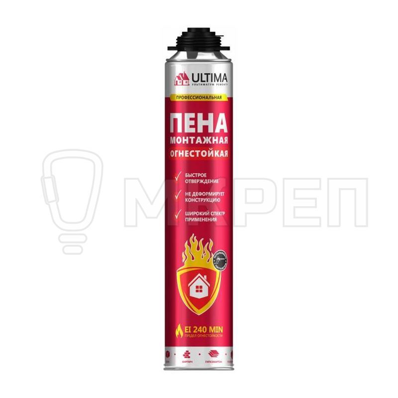 Монтажная пена ULTIMA PRO 65 ОГНЕСТОЙКАЯ - надежная герметизация и теплоизоляция, устойчивая к возгоранию. Замедляет воспламенение конструкций, защищает от дыма и огня до 240 минут.