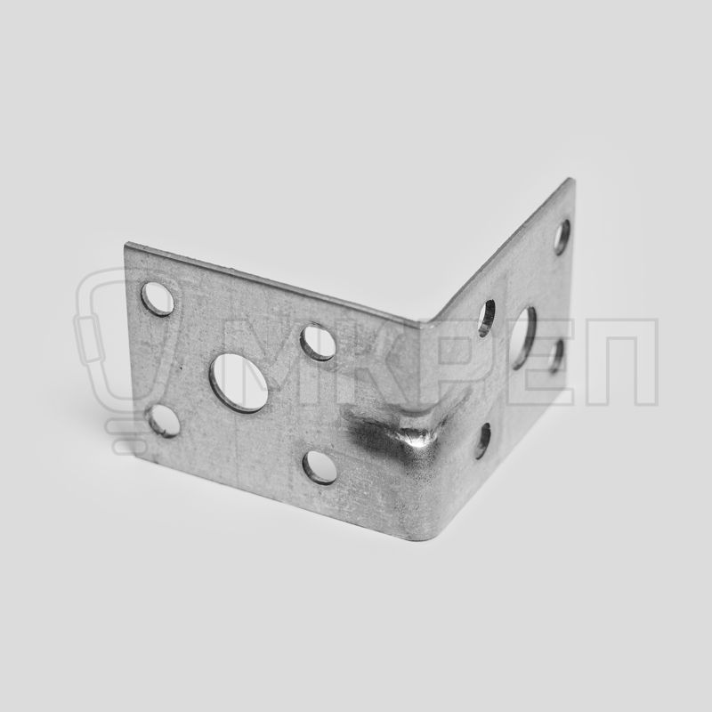 Уголок крепёжный усиленный KUU — металлическая пластина, согнутая под прямым углом. По центру проходит ребро жесткости. На обоих плечах (сторонах уголка) есть отверстия круглой формы.
