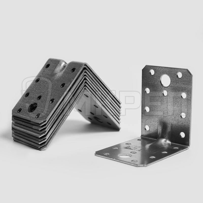 Уголок крепёжный усиленный KUU — металлическая пластина, согнутая под прямым углом. По центру проходит ребро жесткости. На обоих плечах (сторонах уголка) есть отверстия круглой формы.