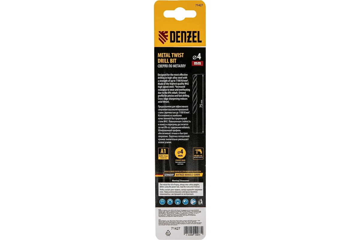 Кобальтовое сверло по металлу Denzel 71427 диаметром 4 мм, из стали HSS Co-8%, позволяет получать отверстия высокой точности в нержавеющей стали, цветных металлах, легированных и нелегированных сталях с пределом прочности до 1100 Н/мм2, а также в жестком пластике. Угол заточки 135° обеспечивает повышенную точность и чистоту сверления.