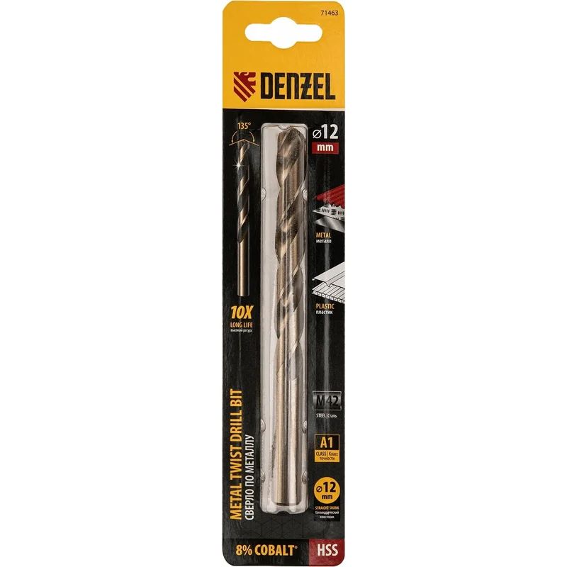 Кобальтовое сверло по металлу Denzel 71463 диаметром 12 мм, из стали HSS Co-8%, позволяет получать отверстия высокой точности в нержавеющей стали, цветных металлах, легированных и нелегированных сталях с пределом прочности до 1100 Н/мм2, а также в жестком пластике. Угол заточки 135° обеспечивает повышенную точность и чистоту сверления.