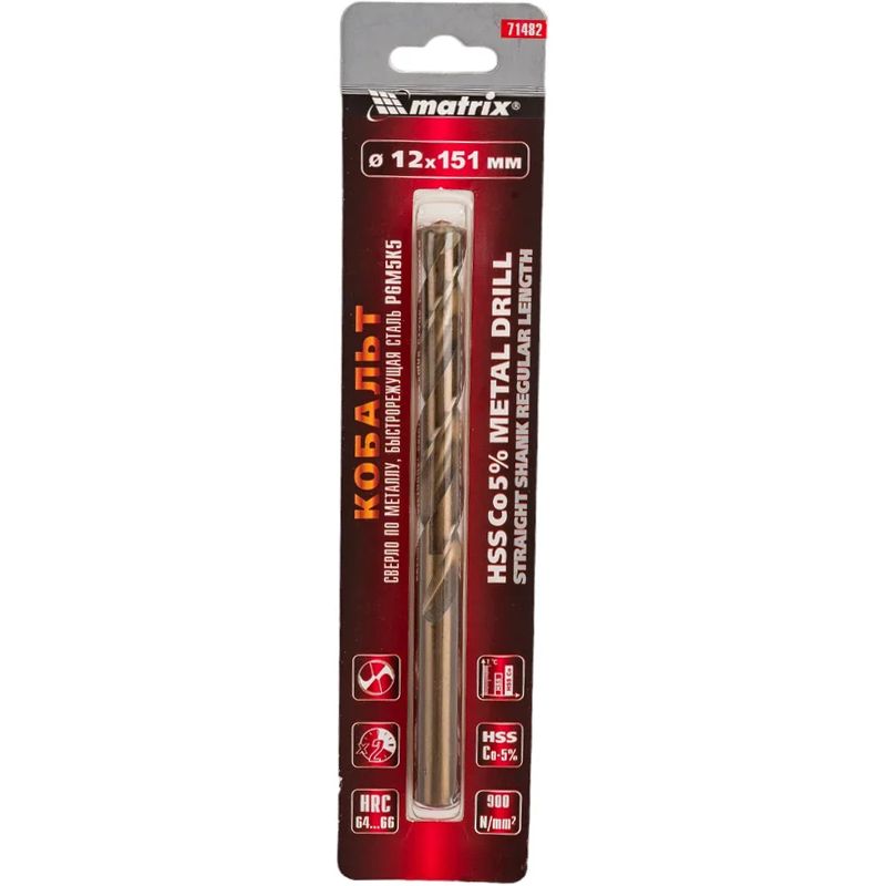 Сверло Matrix диаметром 12 мм, из стали HSS Co-5%, имеет угол заточки 135 градусов, оптимальный для сверления легированных и цветных металлов. Подходит для профессионального использования на строительной площадке.