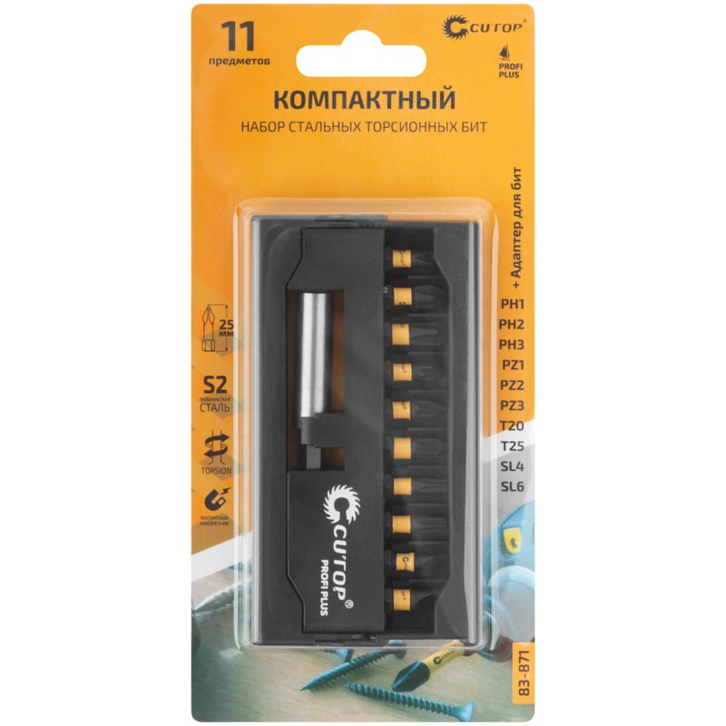 Торсионных бит 25 мм 10 шт: PH1, PH2, PH3, PZ1, PZ2, PZ3, T20, Т25, SL4, SL6. Адаптер для бит, с магнитным держ-лем 1 шт.