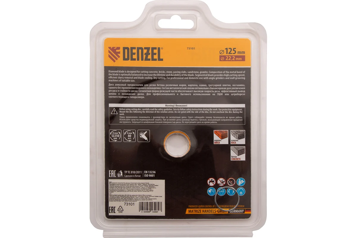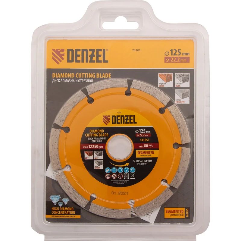 Отрезной сегментный алмазный диск Denzel 73101 диаметром 125 х 22,2 мм — оснастка для УШМ, использующаяся для сухой резки свежего и старого бетона, камня, кирпича, шлакоблока, мрамора, тротуарной плитки, гранита. Диск сегментного типа отличается высокой производительностью даже при интенсивных нагрузках. Подходит для бытового и профессионального использования.